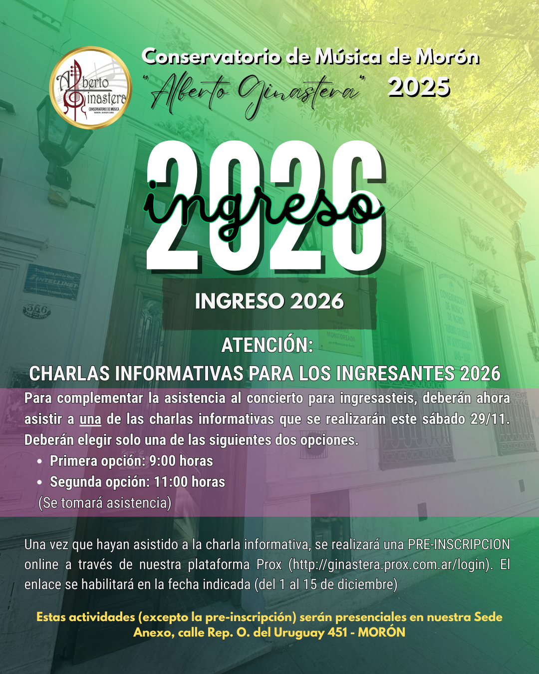 El Conservatorio de Música de Morón «Alberto Ginastera» es una Institución Estatal con 70 años de historia y reconocimiento por la calidad de sus egresados.